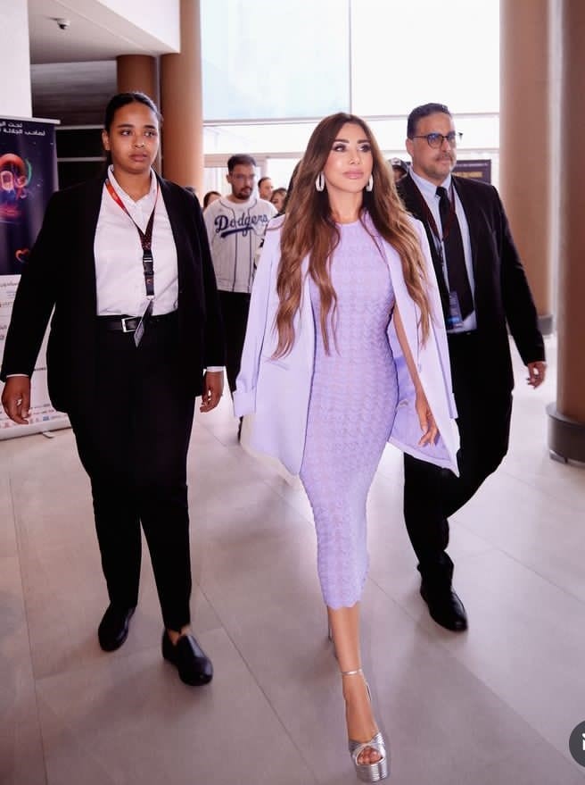 وكانت كرم قد طلت عقب ذلك بهندمة كلاسيكية بلون الليلا “البنفسجي” الملوكي في المؤتمر الصحافي الذي سبق حفلها. ثوب ضيق يحزم الجسم ورمت فوق اكتافها جاكيت طويلة من نفس اللون وانتعلت حذاء فضياً. فبدت مشرقة وفرحة بتلك الألوان التي تنم عن التوازن والشغف.