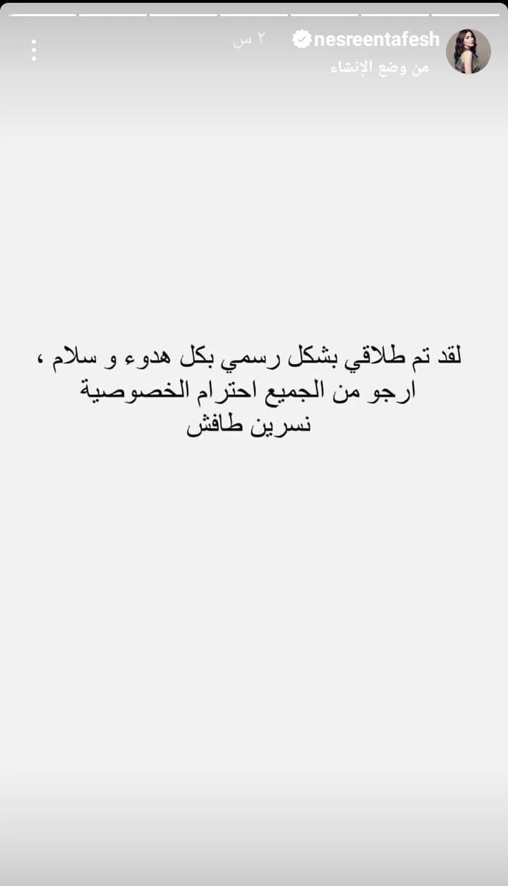 وأعلنت نسرين طافش الطلاق عبر ستوري حسابها الشخصي بموقع انستغرام، جاء فيه: لقد تم طلاقي بشكل رسمي بكل هدوء وسلام، أرجو من الجميع احترام الخصوصية.