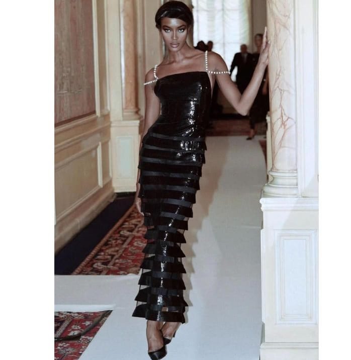 تمر كامبل على السجادة الحمراء في كان خلال مهرجان السينما بدورته77  وهي مرتدية ذاك الثوب الأسود من أرشيف دار Chanel، من مجموعة الأزياء الراقية لخريف 1996، كانت ظهرت به وقتها في عرض الأزياء، وجاء مقاس الفستان مناسبا لها اليوم.