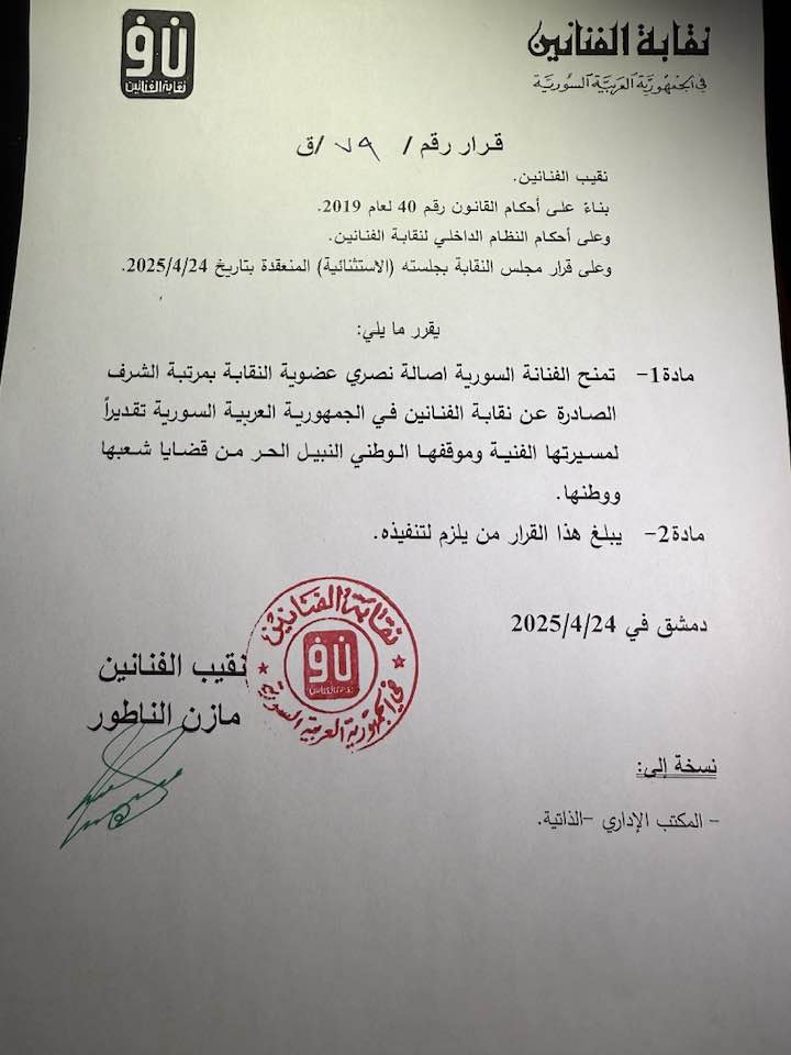 • نقابة الفنانين السورية تمنح أصالة وفضل شاكر عضويتها مع مرتبة الشرف