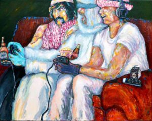 – السينما أصل الحكاية كونها عززت لدي مفردات الفن بهوامشها قبل متونها وذلك بفضل ذاكرتها الخالدة، ففي نشأتي لم أتأثر بصرياً بالفن التشكيلي و لم أكن أميل إلى دخول كورسات تطوير مهاراتي الفنية. ولم استثمر في تخصصي الأكاديمي “التربية الفنية”، بينما السينما بعطاياها التكوينية علمتني التلوين والمنظور و الضوء والظل ولغة العيون والمشاعر ووجود الموديل الحي أمام غيابه التام في الواقع المحافظ آنذاك، هذا من الجانب التقني، أما الجانب الإنساني علمتني الشفافية و كسر حاجز الخوف والتصالح مع الهشاشة و الحس الساخر والفانتازيا.