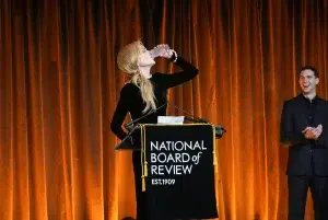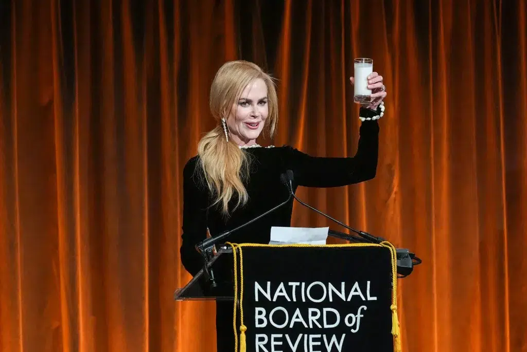 لفتت الممثلة نيكول كيدمان الحضور بتصرفها خلال تلقيها أخر جائزة تكريم لها من قبل NBR كأفضل ممثلة. تعرف كيدمان التي حظيت بالكثير من الجوائز على مدى سنوات من النجومية من أوسكار وغولدن غلوب وإيمي وبرايم تايم وغيرها كيف تثير الأجواء، أحد افضل الممثلات في العالم رفعت كأس الحليب وفي ثواني شربت الكوب مما أذهل جميع الحاضرين في حفل توزيع جائزة المجلس الوطني للمراجعة NBR.