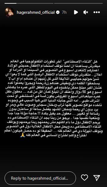 وكتبت هاجر أحمد عبر خاصية الاستوري بحسابها على انستغرام: هل الذكاء الاصطناعي أخر تطورات التكنولوجيا في العالم ميقدرش يساعدنا إن احنا نوقف استخدام الأطفال حديثي الولادة، اللي أعمارهم لا تتعدى أسبوع في التصوير في السينما أو الدراما أو إعلان؟