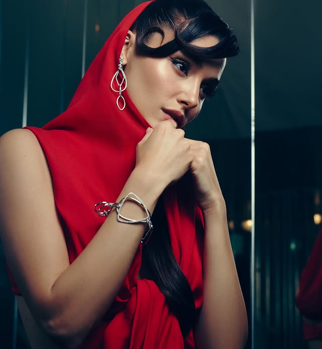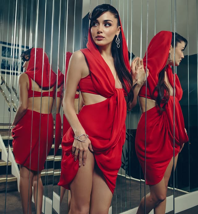 في جلسة تصوير سابقة، بدت هاندا إرتشيل مغرية بفستانٍ أحمر ناري، اختاره لها خبير المظهر إينان كيرديمير (Inan Kirdemir)  من مجموعة الألبسة الجاهزة لربيع وصيف 2025 للمصمّم الإيطالي “جيامباتيستا فالي” (Giambattista Valli)، وهو مميّز بقصّة قصيرة جداً بنمط التقطيع ومقرون مع قلنسوة (غطاء للرأس).