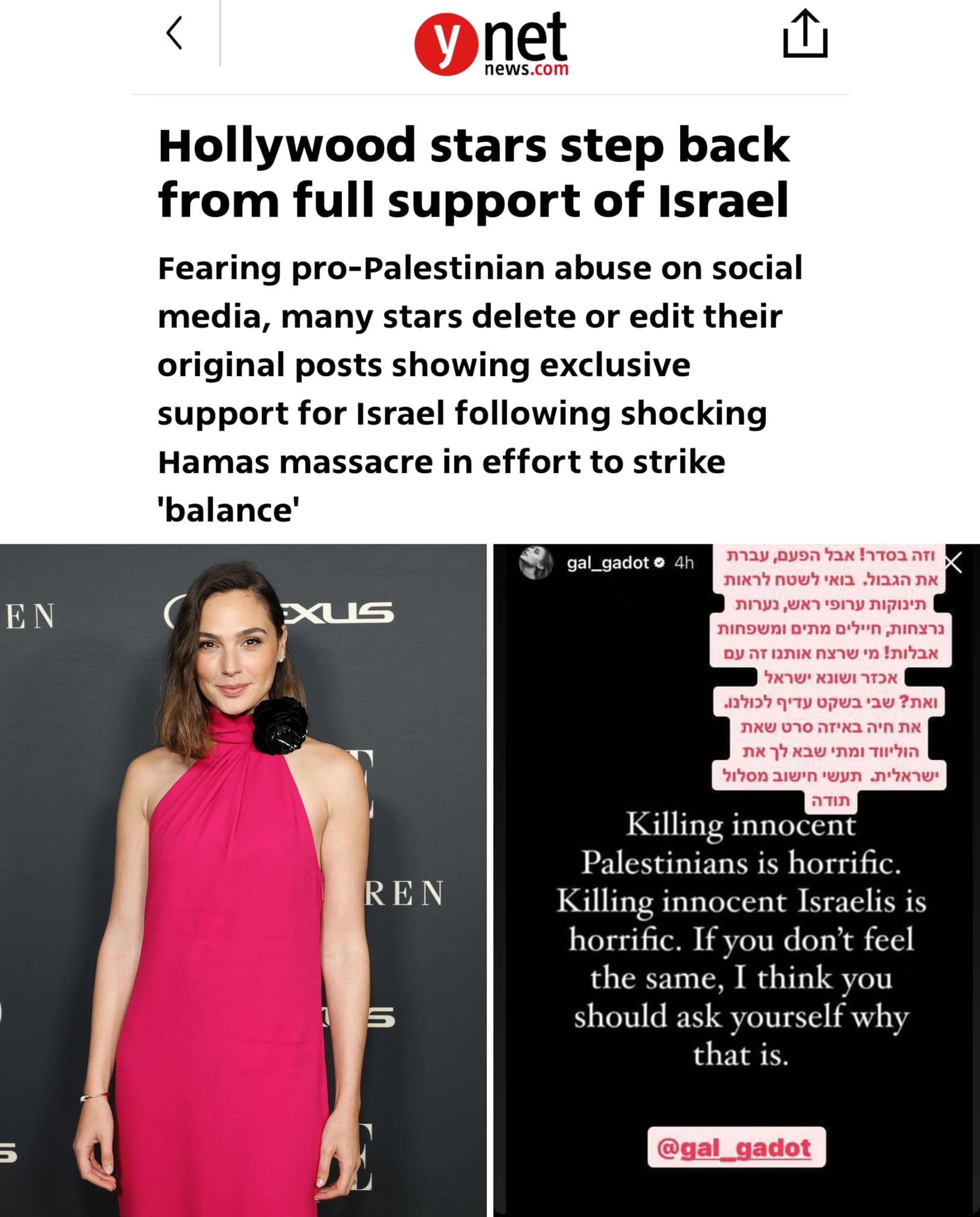وكتبت بطلة فيلم “وندر وومان” على صفحتها “قتل الفلسطينيين الأبرياء أمر مروع. وقتل الإسرائيليين الأبرياء أمر مروع. إذا كنت لا تشعر بنفس الشيء، أعتقد أنه يجب عليك أن تسائل نفسك عن السبب”.