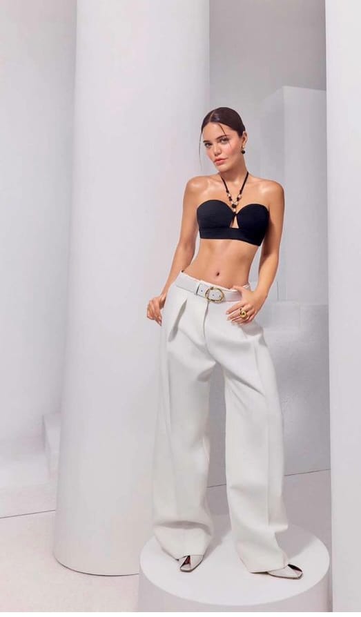 هلال التي اعتمدت اللون الأبيض فارتدت بنطلون كلاسيكي أبيض خصر عال مع فاست قصير أسود يظهر ثنايا البطن.