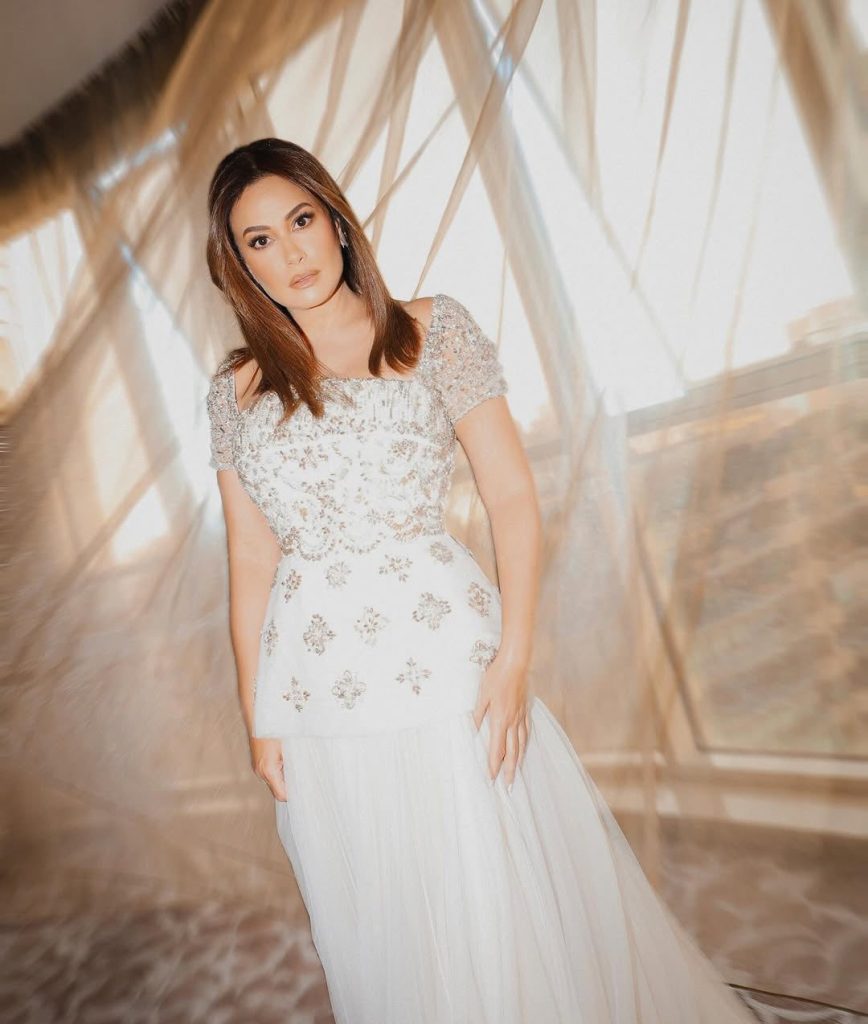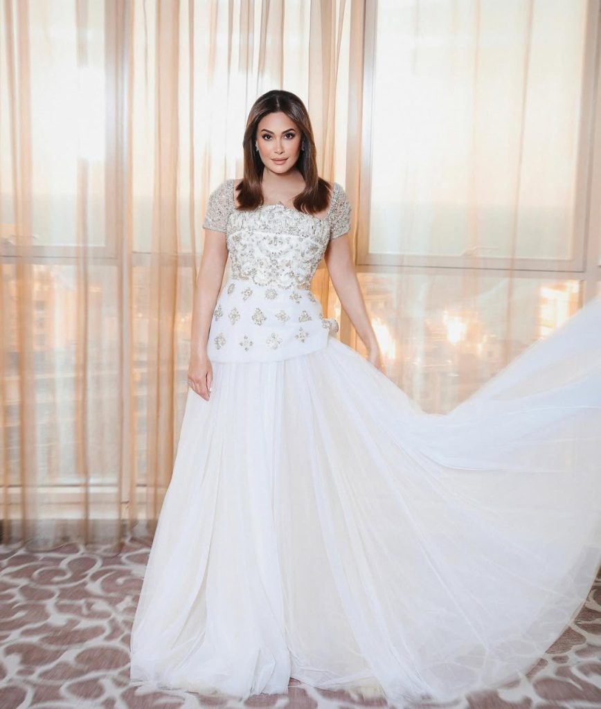 التصميم الأبيض من توقيع المصمم سعيد قبيسي SAIID KOBEISY. ما ميز التصميم تنورته من التول المنفوشة، فيما جاء الجزء العلوي مرصعاً بالتطريزات البراقة مع الأكمام القصيرة والياقة المربعة، وأبرز الفستان رشاقة قوامها مع الخصر الضيق، وبدت فيه وكأنها عروس.