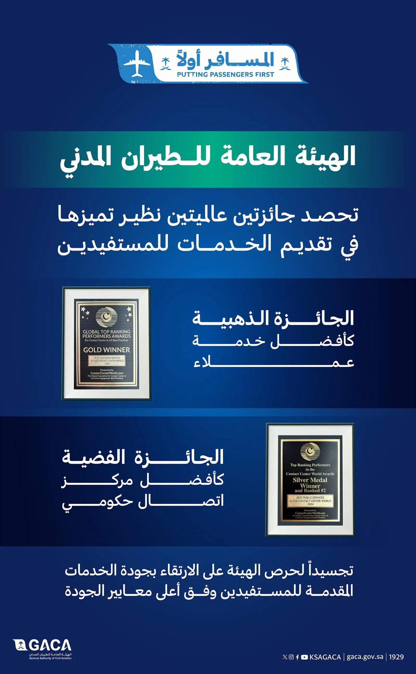 حصدت الهيئة العامة للطيران المدني السعودي ممثلة بمركز العناية بالمستفيدين على جائزتين عالميتين، الأولى “ذهبية” أفضل خدمة عملاء، والثانية “فضية” أفضل مركز اتصال حكومي، وذلك خلال مشاركتها في المؤتمر السنوي لمركز الاتصال العالمي (Contact Center World) الذي أقيم في مدينة لندن بالمملكة المتحدة، بمشاركة العديد من الجهات الحكومية والشركات حول العالم.