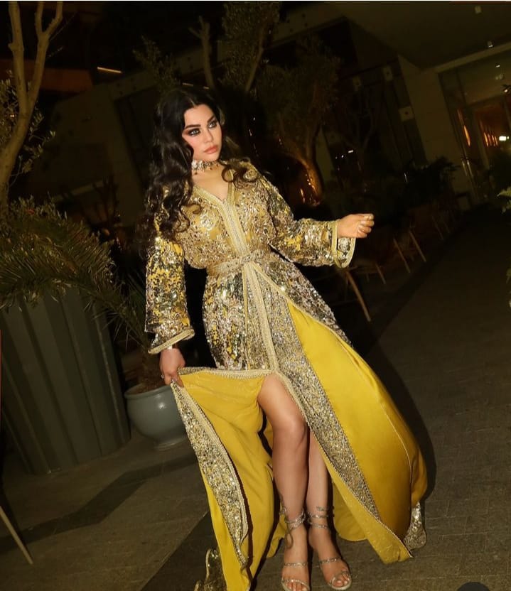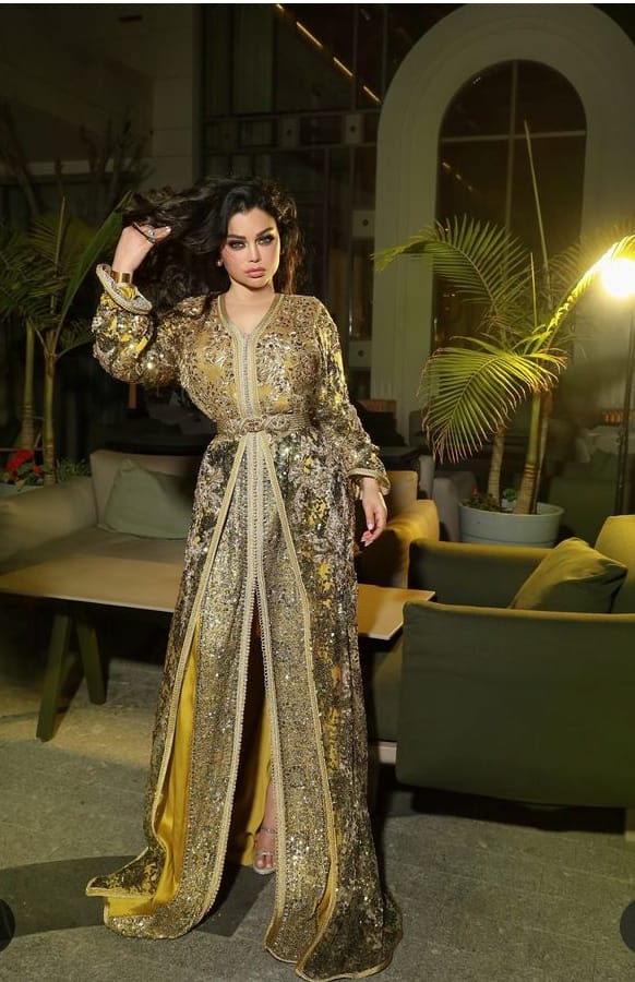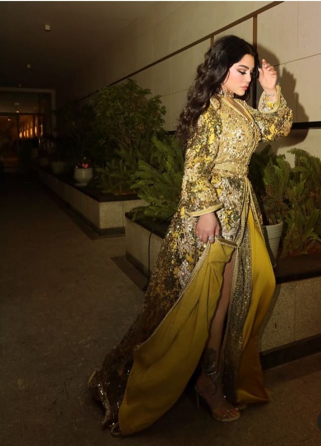 تتألق هيفاء وهبي على وقع الذهبي والتراث بعباءة فاطمة الفيلالي المغربية. قفطان متوهج بالحرفية والتطريز الأنيق المرفه.