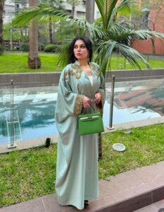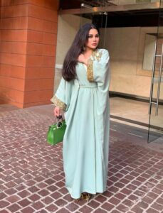 وارتدت هيفاء فستاناً أبيض من ساتان الحرير بقصّة ضيّقة معتدلة الطول، أقرنته مع عباءة تقليديّة باللون الأخضر المائي، صُمّمت خصيصاً لها من علامة Julyas Dresses بالتعاون مع ByRoots، وهي مطرّزة يدوياً بالخرز والترتر الذهبي، ويبرز في وسط الظهر تطريز على شكل إسم الديفا باللغة الأجنبيّة. كذلك، تزيّنت بقرطيْ أذنيْن طويليْن من النمط الشرقي، وحملت حقيبة من الجلد باللون الأخضر المنعش Kelly 25 Veau Epsom Tri-Color من Hermes، كما انتعلت كندرة مدبّبة بكعبٍ عالٍ، تزيّنها زخرفات الورود الذهبيّة اللون من Valentino.