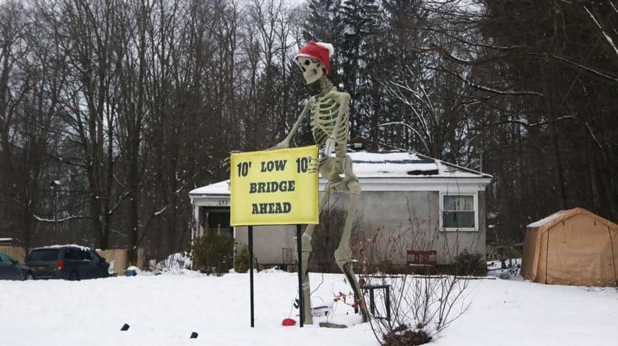 يبلغ طول الهيكل العظمي ذي القبعة الحمراء حوالي 12 قدمًا. ويحمل بين يديه لافتة صفراء زاهية مكتوب عليها “جسر منخفض أمامك”. كما أسمته العائلة: Crazy Carl.