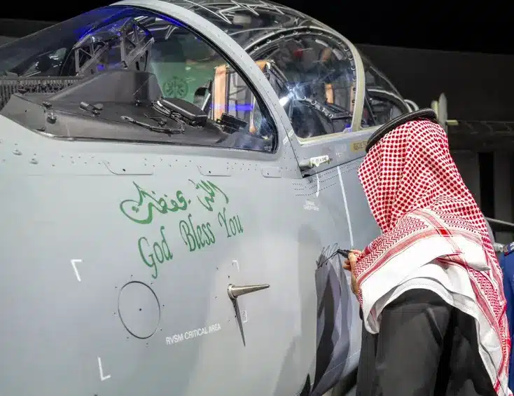 وغرد وزير الدفاع على منصة أكس وكتب: سُعدت بتدشين آخر طائرة نفاثة متقدمة من طراز “هوك تي ١٦٥” تم تجميعها في المملكة بأيدٍ وطنية بشكل كامل، وتكريم العاملين عليها.