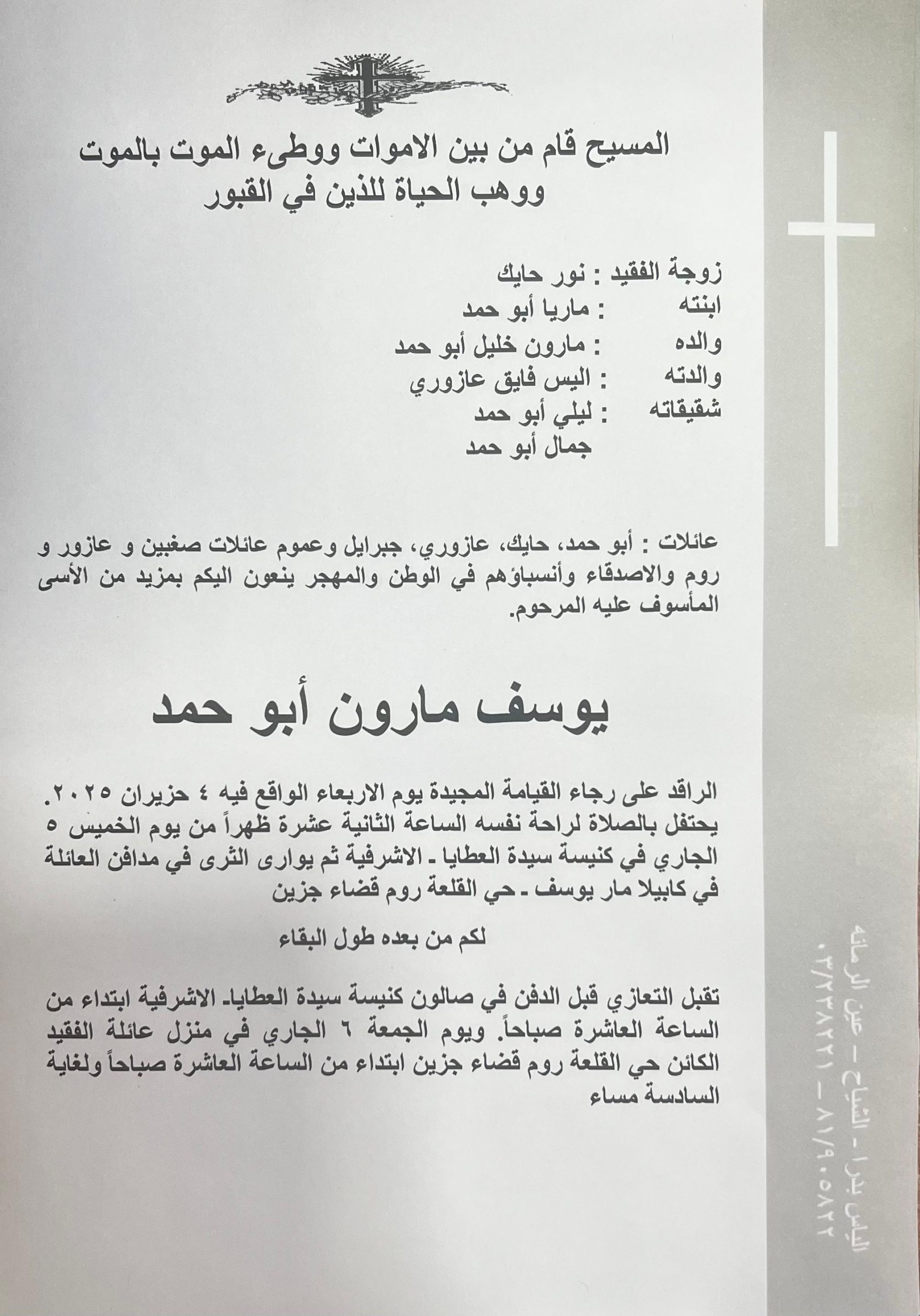 تقبل التعازي قبل الدفن في صالون كنيسة سيدة العطايا – الأشرفية ابتداءً من الساعة العاشرة صباحاً. ويوم الجمعة (6 مايو/أيار الجاري) في منزل عائلة الراحل في حي القلعة روم قضاء جزين ابتداءً من الساعة العاشرة صباحاً إلى السادسة مساءً.