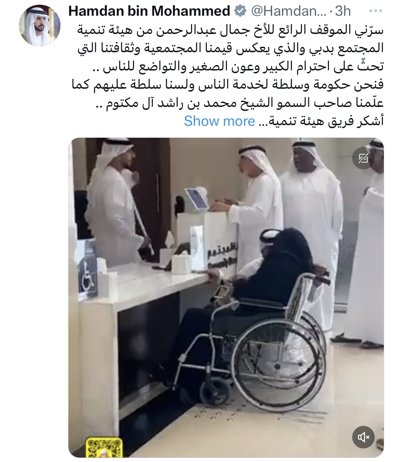 رصد “Snapshot نُص خبر” فيديو يعكس القيم الإنسانية للمجتمع الإماراتي، نشره سمو الشيخ حمدان بن محمد بن راشد آل مكتوم، ولي عهد دبي، رئيس المجلس التنفيذي، عبر حسابه في “إكس” يُثني فيه على موقف “جمال عبد الرحمن” أحد مسؤولي “هيئة تنمية المجتمع في دبي“، وهو يجلس أرضاً لمساعدة إحدى مراجعات الهيئة من كبار السن من المواطنين. واصفاً سموه الموقف بانعكاسٍ لقيم المجتمع وثقافته التي تحثّ على احترام الكبير وعون الصغير والتواضع للناس.