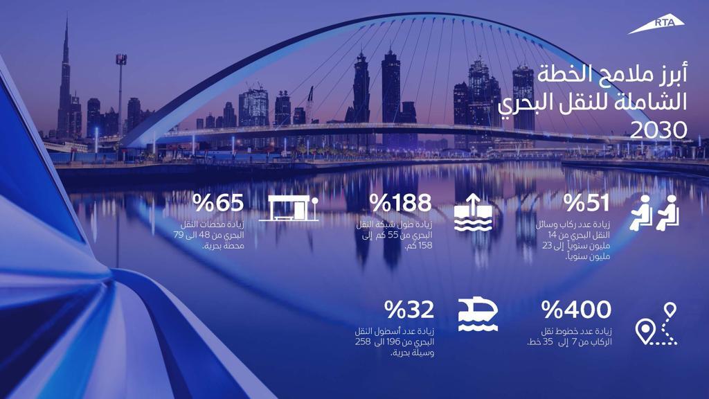 وتتضمن الخطة الشاملة لتطوير النقل البحري في إمارة دبي، تمديد طول الشبكة بنسبة 188٪؜, وزيادة عدد خطوط نقل الركاب بنسبة 400٪؜, وتصنيع أول عبرة كهربائية في العالم، بتقنية الطباعة ثلاثية الأبعاد.