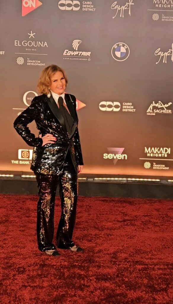 ملفتة الفنانة يسرا بإطلالتها اللماعة على السجادة الحمراء في مهرجان الجونة خلال حفل هشام نزيه المرشح لجائزة إيمي.