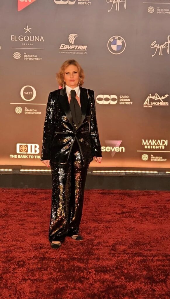 لم تكن هذه الإطلالة اعتيادية للفنانة يسرا بزة رجالية صبغتها بأنوثة البريق. وتلك القميص ذات الياقة الغريبة والشفافة مع ربطة عنق حريرية “كرفات” عقدت بطريقة مغايرة لتقل إن للأنوثة اسلوبها الخاص في تأنيث البدلات.