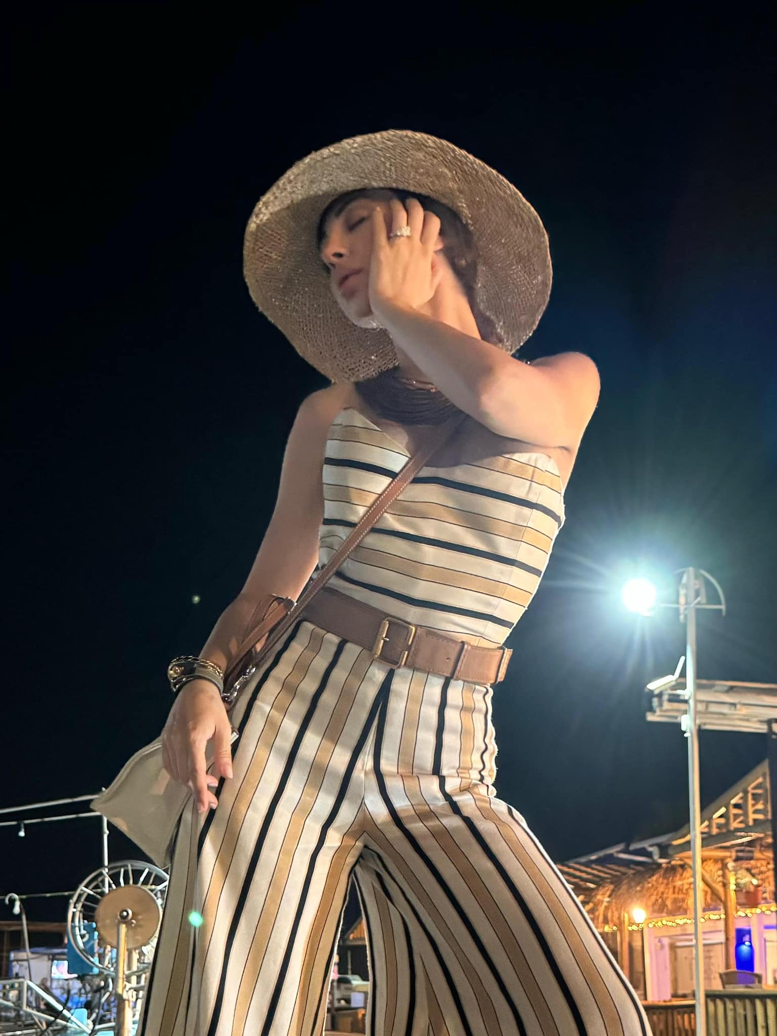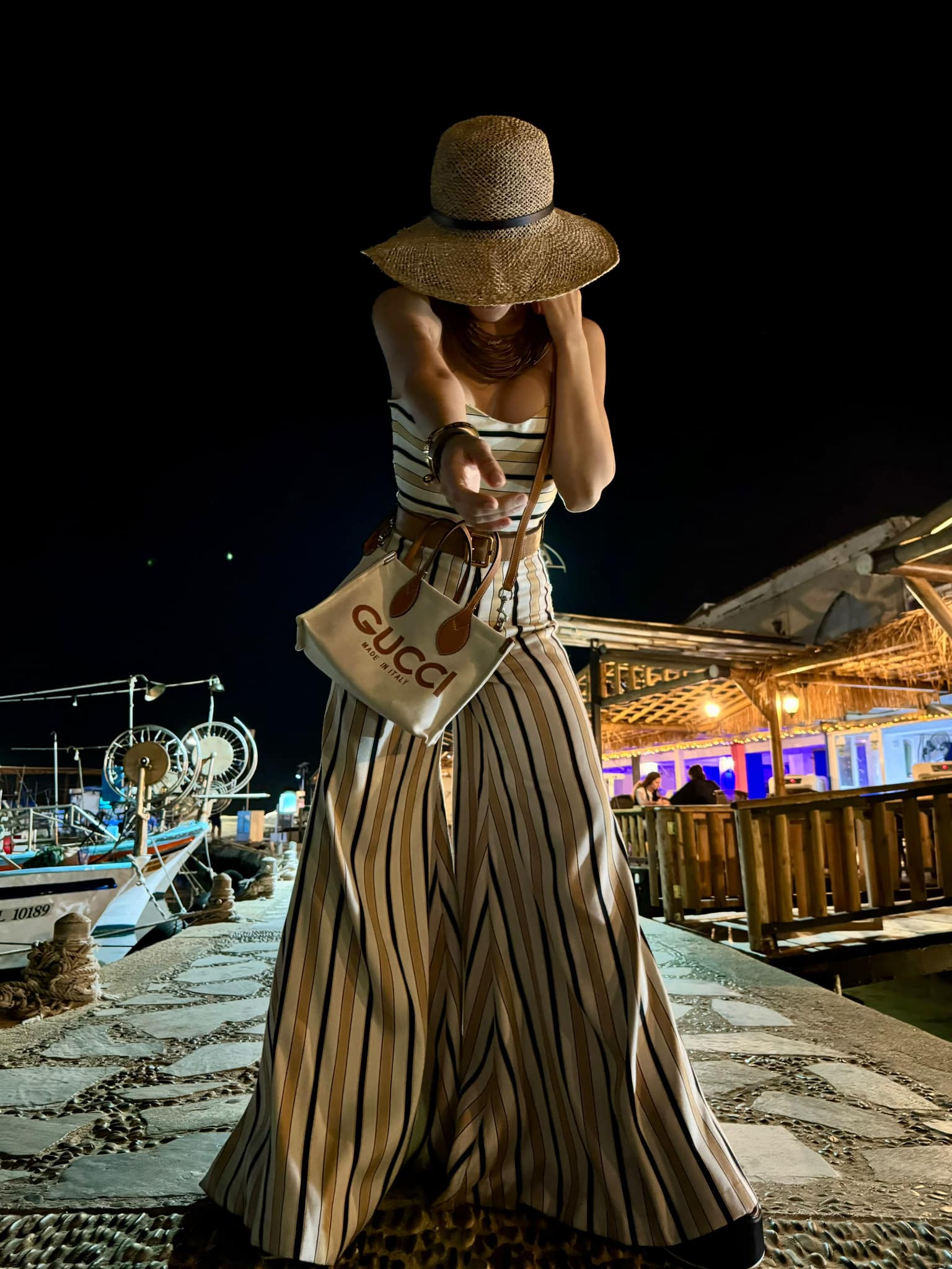مضافاً لذلك  التميز في اختيار القبعات والعقود الخرزية الكبيرة والخلاخل تلف كواحلها وحقيبة غوتشي القماشية.  أقل ما يمكن قوله انها صاحبة ستايل.