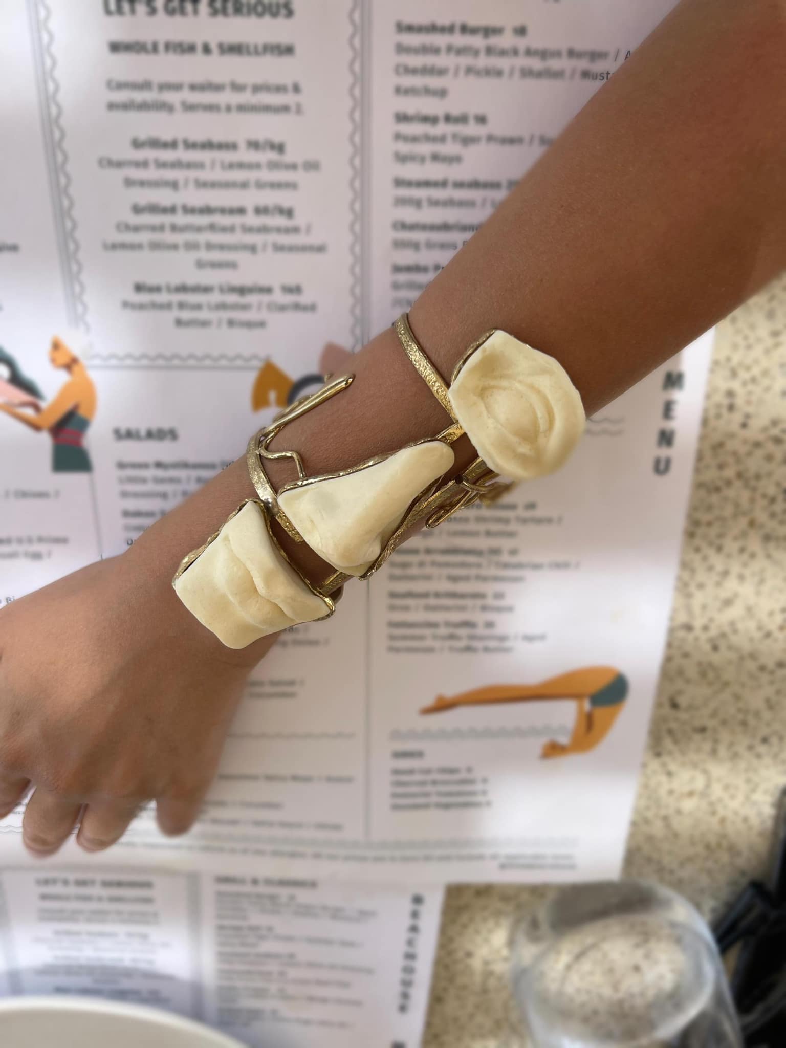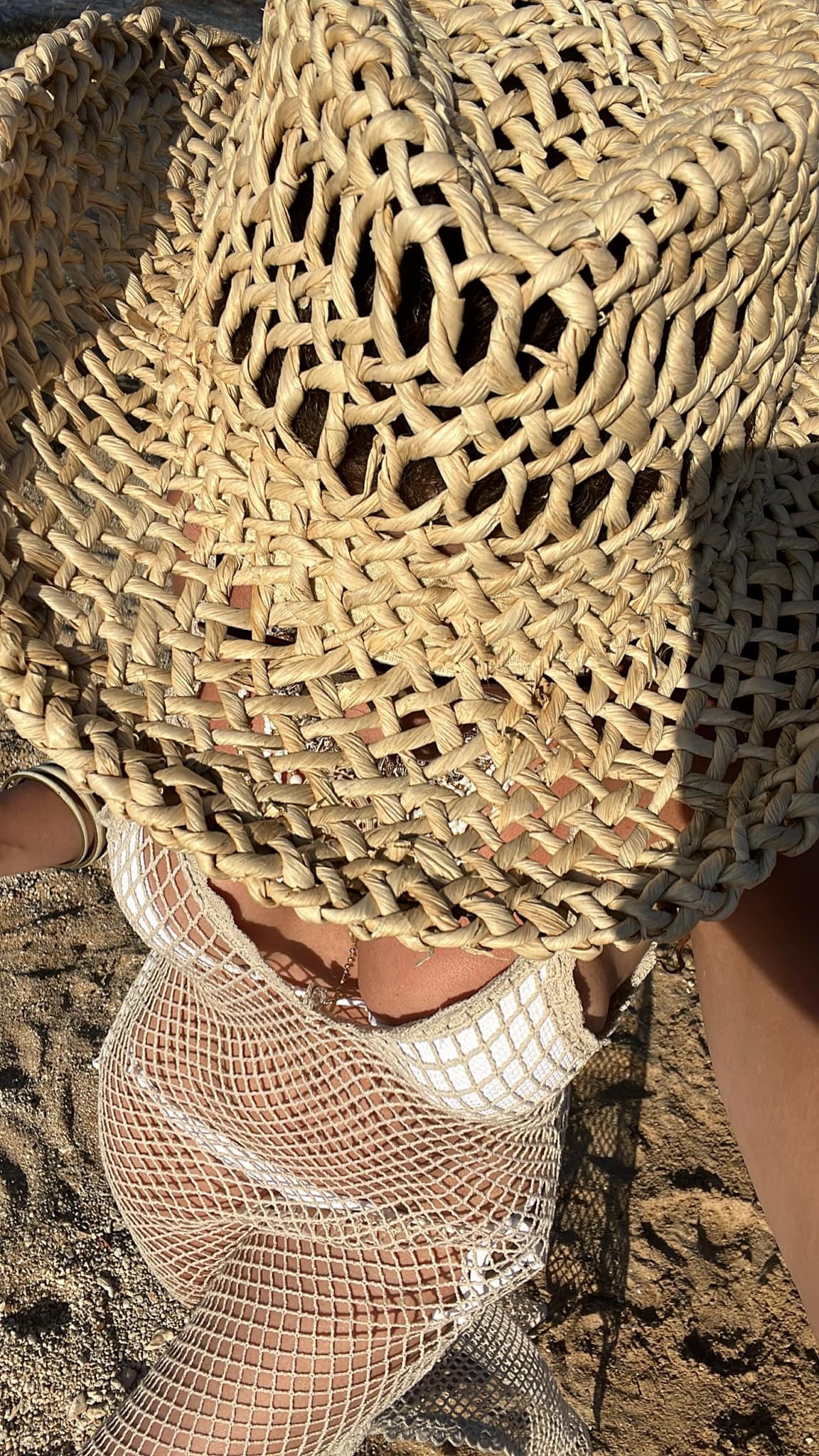 بطريقة فنية ترسم معالم وقتها. قبعة من قش ونظارات شمسية ولباس بحري أنيق بلون الرمل وعيون مختفية تحت حجب القبعة والقش. وسوار على شكل وجه ملفوف بالذهبي المعتق تبدو كقطعة حرفية فنية مبتكرة وهي تتزين بها وعن قصد تفردها في صورة لتعطي دلالة عن التميز في اختيار أكسسواراتها.
