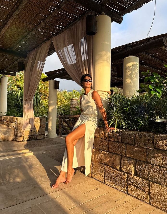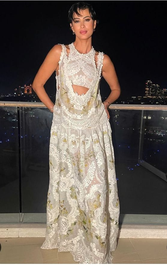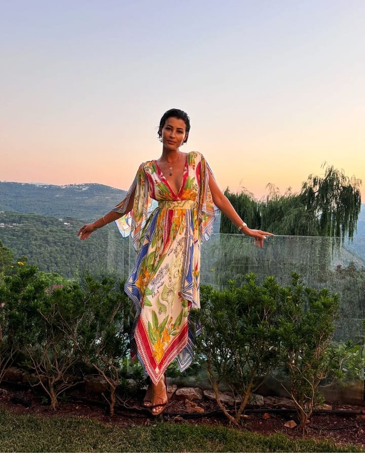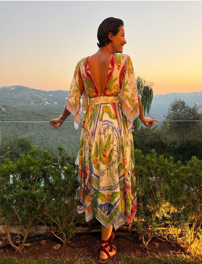 وتختار أيضاً ثوباً بايج فيه تخريج من صنع يدوي من مجموعة زيمرمان” تميزه بقماشه القطني والوانه الهادئة وقصته المريحة ولمسة الخصوصية في الشغل اليدوي للكروشا الذي يزين الثوب.