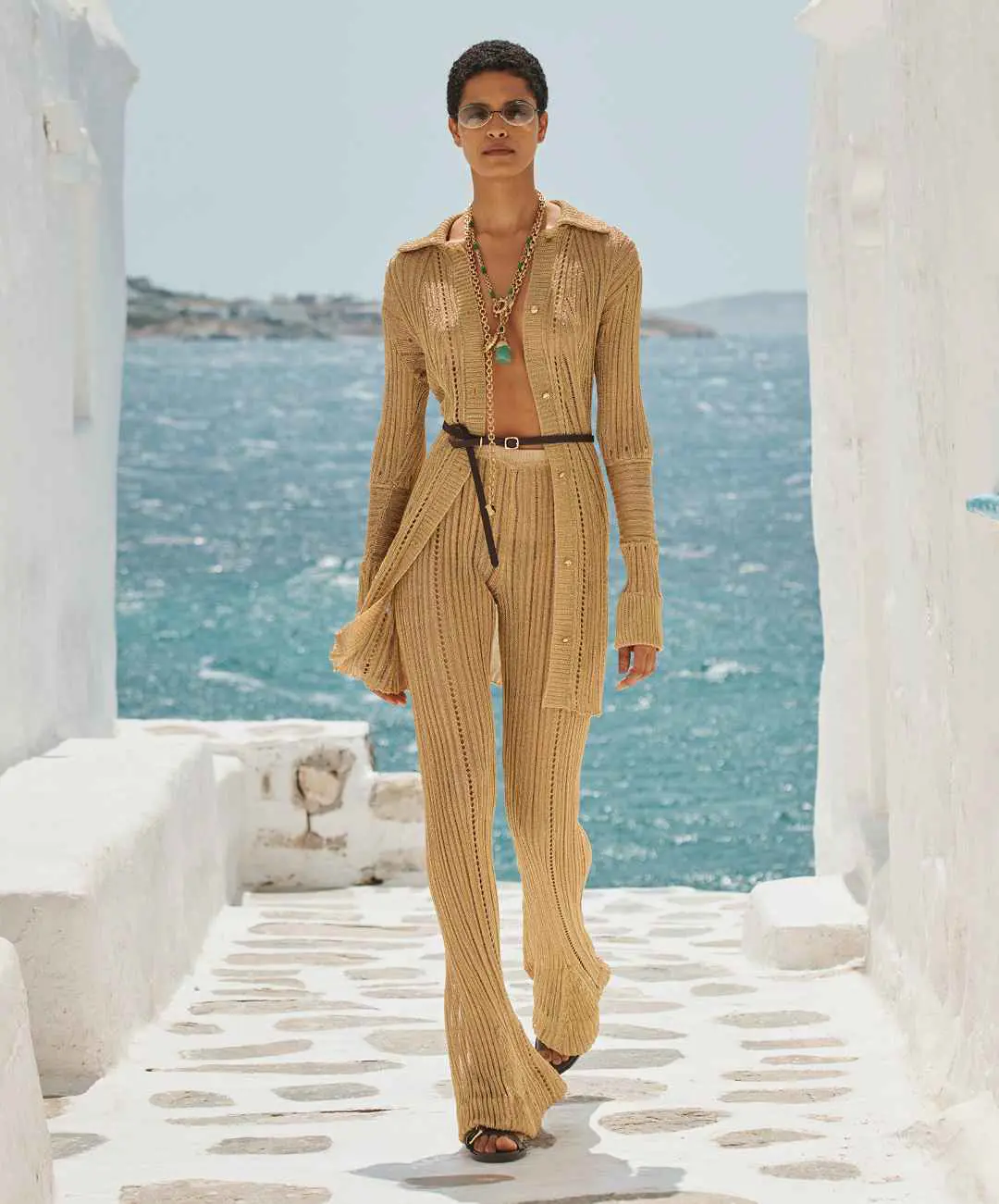 كما برزت سراويل الكروشية في مجموعة Etro كروز 2026، حيث نسقت سراويل كروشية باللون الكاكي مع فساتين متناسقة بطول الركبة، وأكملت الإطلالة بصنادل وحقائب من جلد الغزال.