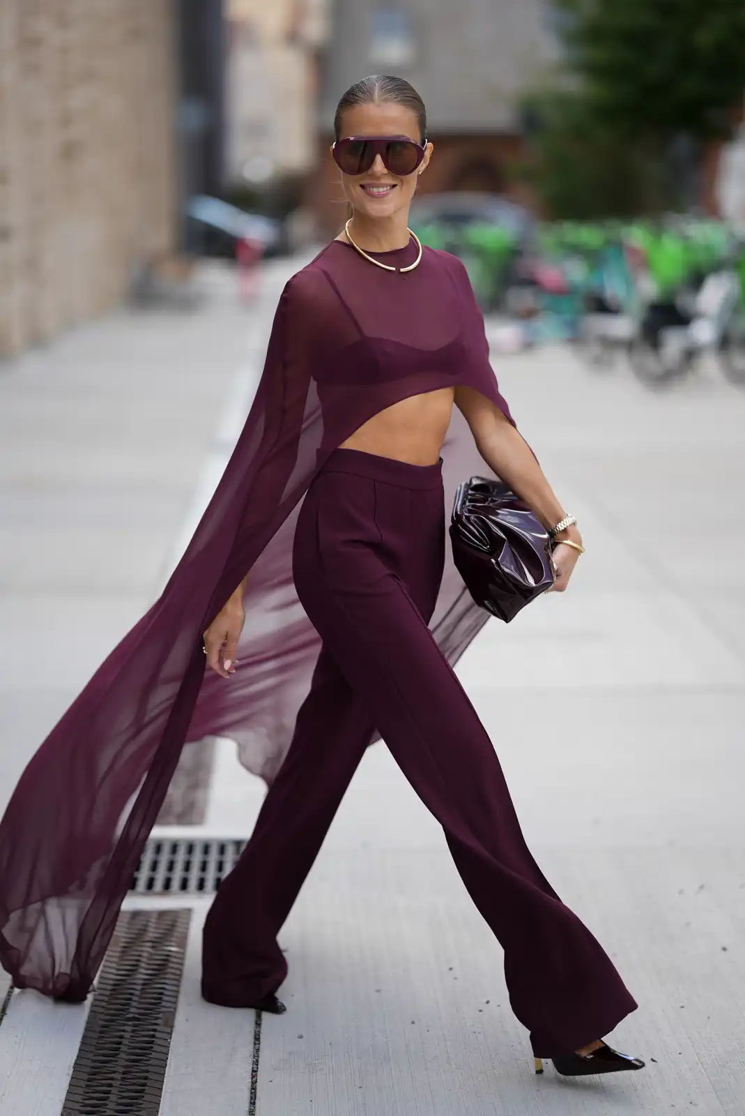 حقيبة جلدية باللون نفسه تضيف لمسة من الأناقة، فيما تبقى الإكسسوارات البسيطة مهمة لإبراز جمال الخامات. هذا التنوع في القماش يحوّل أي لون من ممل إلى فاخر.