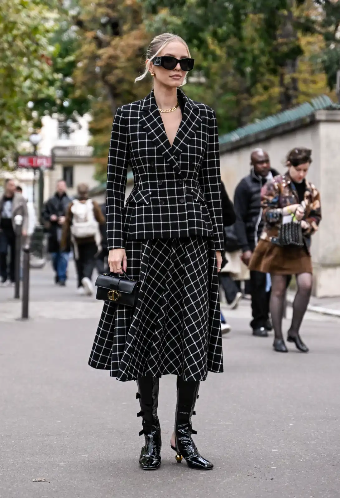اختيار طقم مونوكروم بطبعات مثل المربعات أو الخطوط يضيف حركة وستايلا مميزا للإطلالة. الحفاظ على الإكسسوارات بسيطة كحقيبة جلدية أو بوت بلون حيادي يضمن أن تظل النقشة هي محور الإطلالة.