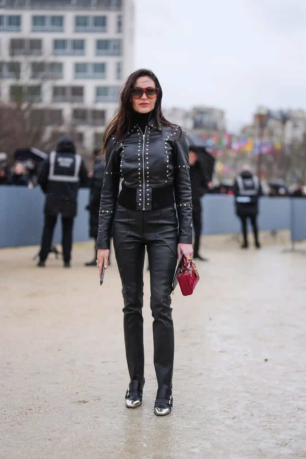 جاكيت جلدي مع بنطلون من الخامة نفسها يخلق ستايل درامياً يلفت الأنظار. ولتفادي المظهر الممل، يمكنك إضافة حقيبة بلون مختلف مثل الأحمر، أو الاكتفاء بإكسسوارات معدنية بارزة تضيف لمسة جريئة. هذه الإطلالة مرنة ويمكن اعتمادها في أوقات مختلفة بحسب القطع التي تختارينها، سواء للإطلالات النهارية أو المسائية.