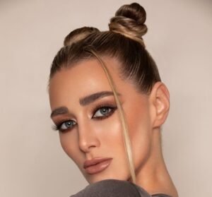 إطلالة نهارية شبابية ماكياج باللون الترابي مع كونتور خفيف وظلال لامعة على الجفون السفلية تمنح العينين مزيدا من الاتساع وأحمر شفاه بلون بوبا نود وشعر فيه عودة لموضة التسعينات برفعه على شكل كعكتين.