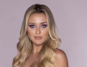إطلالة مسائية تناسب السهرات والحفلات، مكياج بلون البنفسج الفاتح وعينين مسحوبتين على شكل عيون القطة مع إضافة رموش طبيعية وحبات من اللولو الصغيرة على الجفن العلوي وأحمر شفاه بوبا نود مع تسريحة ويفي عريض “يمكنك استخدام العدسات الملونة وإضافة وصلات للشعر”.