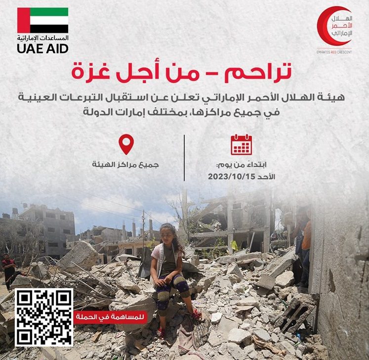 حملة “تراحم من أجل غزة” التي تُشرف عليها وزارة الخارجية الإماراتية، بالتعاون مع “هيئة الهلال الأحمر” الإماراتي و”برنامج الغذاء العالمي”، وبالتنسيق مع وزارة تنمية المجتمع، نظمت فعاليات في مناطق مختلفة من دولة الإمارات العربية المتحدة، وتوزعت بين “الاتحاد أرينا” في العاصمة أبوظبي بالتعاون مع “هيئة الهلال الأحمر” الإماراتي، وفي منطقة “فسيتفال أرينا” بإمارة دبي بالتعاون مع “دبي العطاء”، وفي “مركز البيت متوحد” في إمارة الشارقة بالتعاون مع “جمعية الشارقة الخيرية “و”مؤسسة القلب الكبير”.
