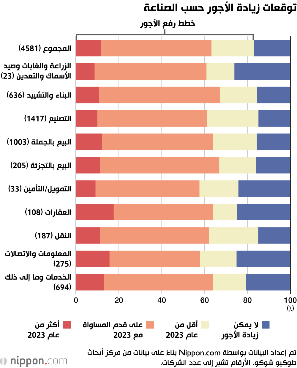 في مسحٍ استقصائي، قامت شركة طوكيو شوكو للأبحاث على 4581 شركة في الفترة بين 1 و11 ديسمبر الماضي، وأظهرت الدراسة أن 82.9% من هذه الشركات، أي 3799 شركة، تعتزم رفع الأجور في عام 2024. ومن هذه الشركات، تخطط 51.5% لتنفيذ زيادة في الأجور على قدم المساواة، بينما تعتزم 19.7% تطبيق زيادة أقل في الأجور، و11.6% تخطط لزيادة أكبر. وفي الوقت نفسه، أكدت 17.0% من الشركات المشمولة في الدراسة أنه ليس لديها أي احتمال لتنفيذ زيادات في الأجور.