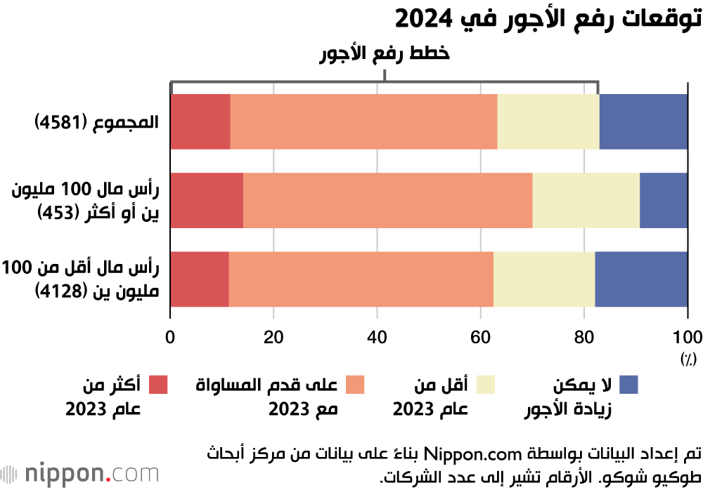من بين الشركات التي تعتزم رفع الأجور في عام 2024، وجد أن 14.1% منها تعتبر شركات كبيرة برأس مال يزيد عن 100 مليون ين، بينما تعتبر 11.3% منها مؤسسات صغيرة ومتوسطة الحجم برأس مال أقل من 100 مليون ين. ومن جهة أخرى، كشفت الدراسة أن 17.9% من الشركات التي لا تعتزم زيادة الأجور تعتبر صغيرة أو متوسطة الحجم، مما يقارب ضعف النسبة بين الشركات الكبيرة التي تبلغ 9.2%. وقد علقت شركة طوكيو شوكو للأبحاث على هذه النتائج بالقول إن ”العديد من الشركات الصغيرة والمتوسطة لا تزال تعاني من تأثيرات تراجع الأداء الاقتصادي، مما يجعل من الصعب عليها رفع الأجور“.