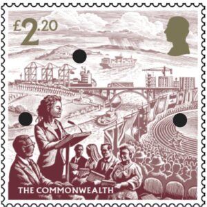 ويسلط طابع الثروة المشتركة، الضوء على موضوعات التجارة العالمية والتعاون والديمقراطية والسلام. وتعكس الصور التي يتضمنها اجتماعًا متخيلًا لل“كومنولث”، وتمثيلًا لألعاب الكومنولث، وبعض أعلام دول الكومنولث، ومقبرة قبور حرب الكومنولث. (الكومنولث هو اتحاد سياسي يضم 56 دولة عضو كانت جميعها تقريبًا أقاليم سابقة للإمبراطورية البريطانية).