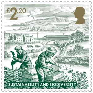 فيما يصور طابع الاستدامة والتنوع البيولوجي، المناظر الطبيعية جنبًا إلى جنب مع أساليب الزراعة المستدامة، ومصادر الطاقة المتجددة مثل الطاقة الكهرومائية والألواح الشمسية. وتسلط صور الغابات المتنوعة ومروج الزهور البرية والحشرات الملقحة الضوء على أهمية الحفاظ على الحياة البرية، بينما تبرز أيضاً الحِرف التقليدية مثل زرع التحوط وتربية النحل.