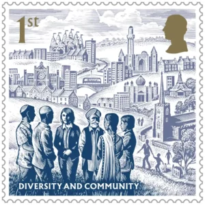 ويُمثل طابع التنوع والمجتمع جميع الأديان، فهو يعكس المجتمع متعدد الأديان والتنوع الثقافي في بريطانيا، حيث يُصور شخصيات تمثل الديانات الإسلامية واليهودية والمسيحية والسيخية والهندوسية والبوذية. فيما تُظهر الخلفية جوانب من بريطانيا الريفية والحضرية والعديد من أماكن العبادة.