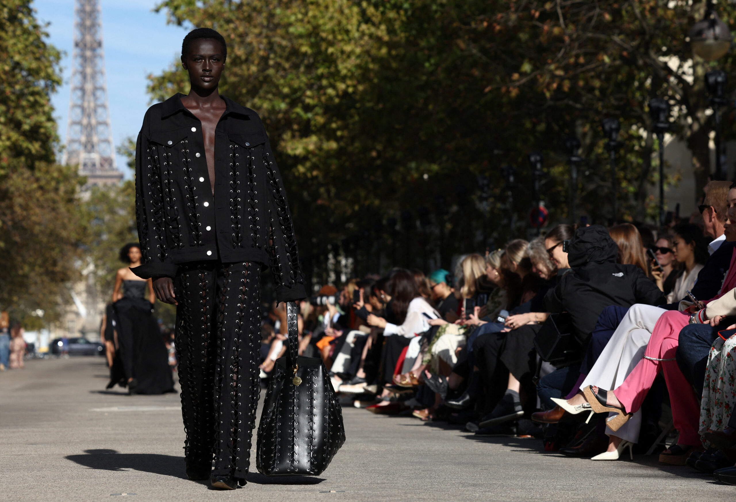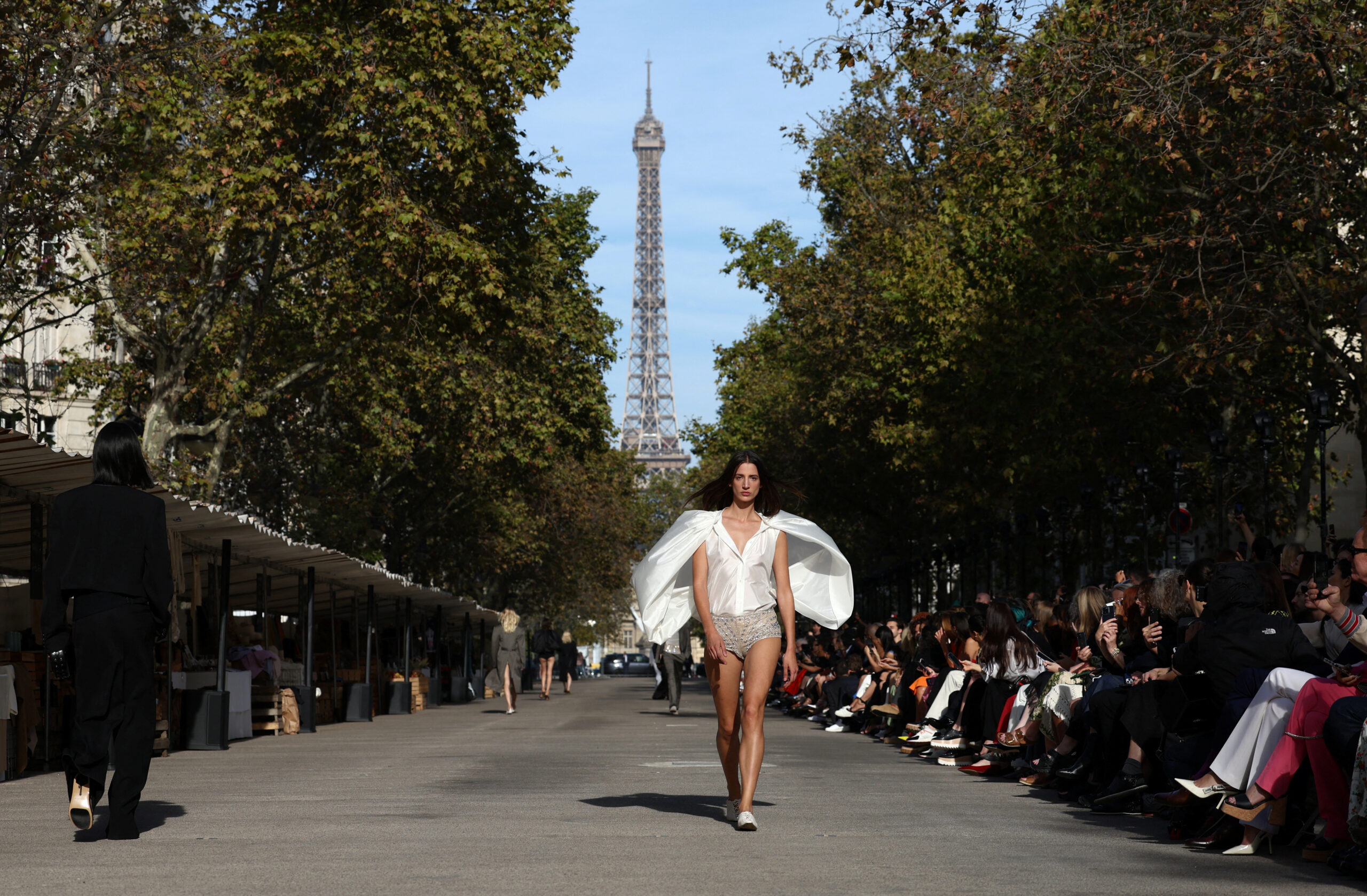 أقامت ستيلا مكارتني عرضها لأزياء الربيع في الهواء الطلق في أحد شوارع باريس مع إطلالة على برج إيفل والأكشاك المكدسة بالمنتجات المستدامة في السوق.