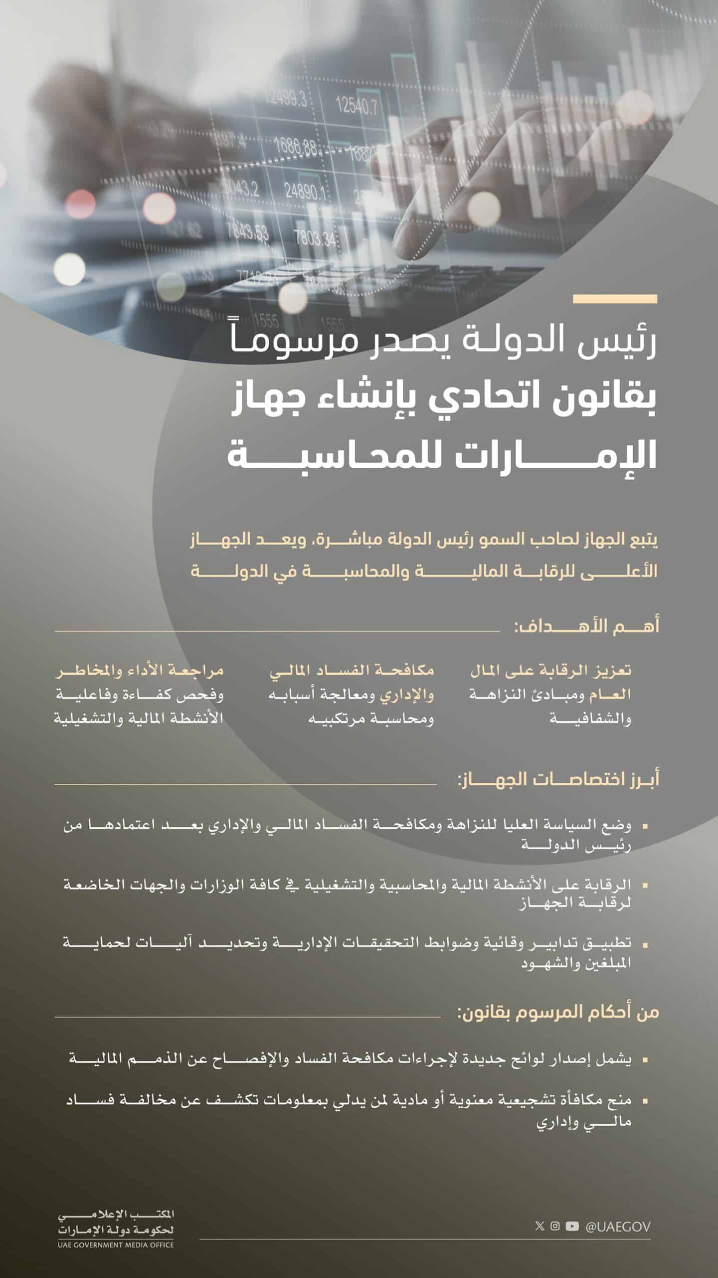 أصدر صاحب السمو الشيخ محمد بن زايد آل نهيان، رئيس دولة الإمارات العربية المتحدة، مرسوماً بقانون اتحادي رقم 56 لسنة 2023 بشأن إنشاء “جهاز الإمارات للمحاسبة”، ويحل الجهاز الجديد محل “ديوان المحاسبة”، ويتبع صاحب السمو رئيس الدولة مباشرة، ويهدف إلى تعزيز الرقابة على المال العام، حيث يعد الجهاز الأعلى للرقابة المالية والمحاسبة والنزاهة والشفافية في الإمارات العربية المتحدة.