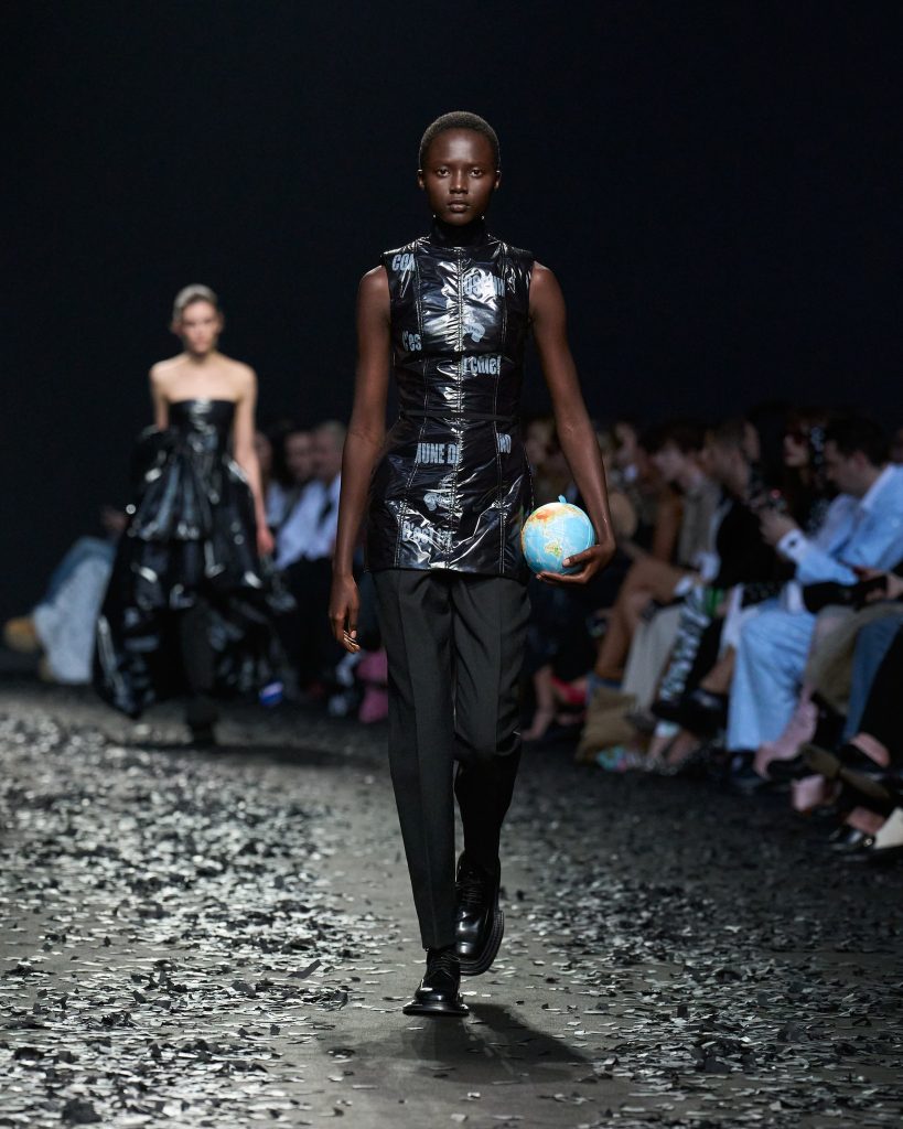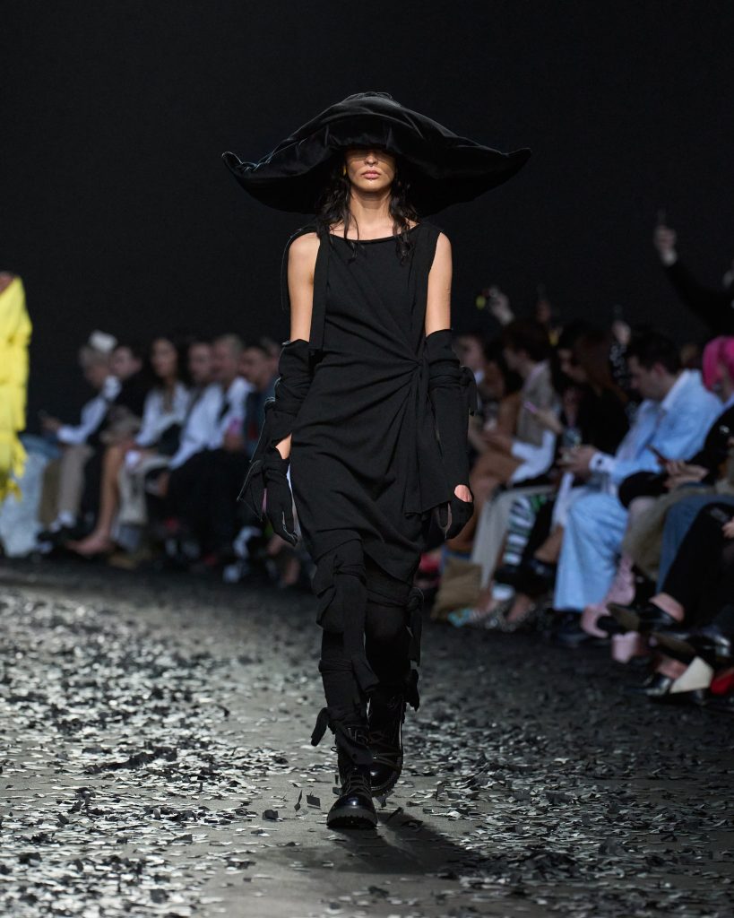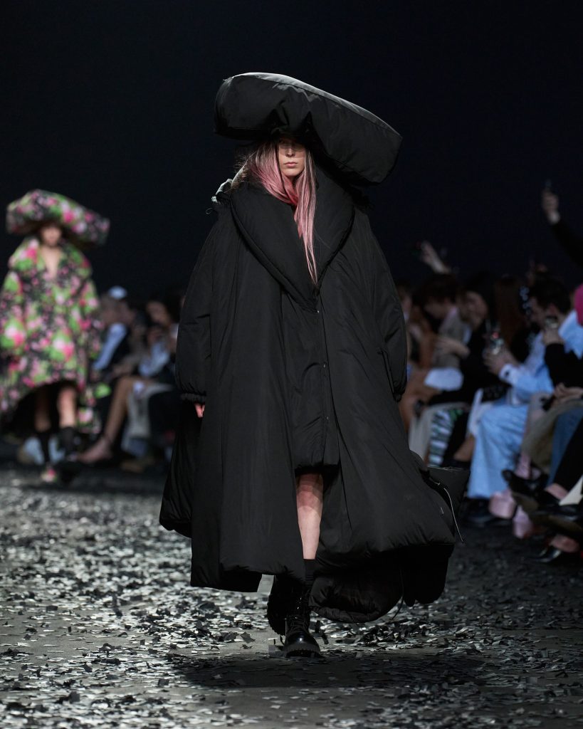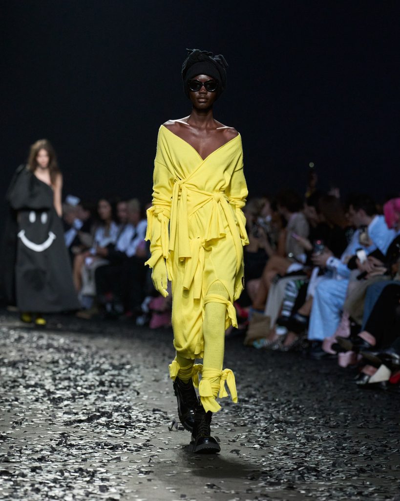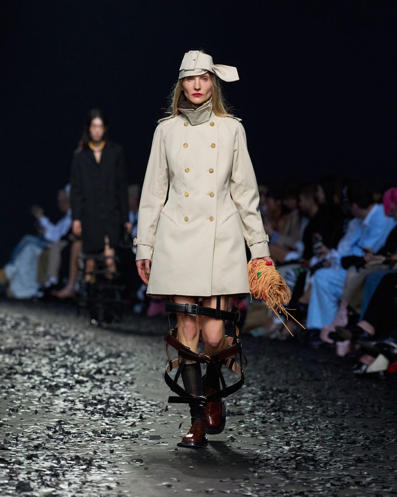من الرأس إلى أخمص القدمين ، تمتلئ Moschino بإكسسوارات واسعة النطاق في عرض جدي قائم على السخرية وبعث الرسائل.