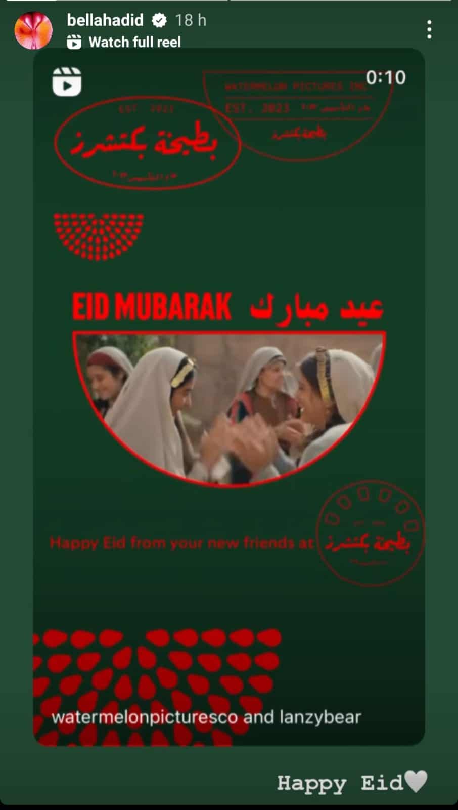 هنأت عارضة الأزياء الأميركية ذات الأصول الفلسطينية بيلا حديد، جمهورها ومحبيها بحلول عيد الفطر السعيد على الطريقة الفلسطينية.