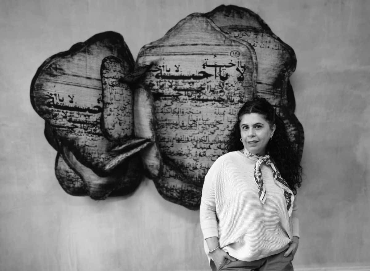 وهذه الأصوات تستحوذ على جناح المملكة في المعرض، حيث يمكن سماع أهازيج الحرب كالعَرضة والدحّة التي كان يؤدّيها الرجال عادة حول “الحاشي” الواقف في وسطهم ليشحذ الهمم ويستنهضها. ولكن، الفرق هنا، أنّ أصوات النساء اللواتي يعلنّ عن أنفسهنّ من خلال الرسومات والأغاني والكتابات، هي التي تؤدّي دور “الحاشي”. وإضافة إلى الأصوات، يمكن التمعّن في الإبداع الذي يرافق هذا العمل الفنيّ أثناء التجوّل في الجناح، حيث سيشقّ الزائر طريقه عبر متاهة من المجسّمات الضخمة المطبوعة بالشاشة الحريريّة والتي تشبه بتلات وردة الصحراء، وهي صخور بلّوريّة تتشكّل في الرمال ويمكن العثور عليها في الصحراء بالقرب من مسقط رأس منال الضويان في الظهران. فهي ترى من هذه الصخور رمزًا للهشاشة وسرعة الزوال والأنوثة والقدرة على التحمّل، وقد عزّزتها أيضًا بالنصوص هنا كما الحال مع مجسّماتها السابقة لهذا العنصر، ولكنّها كانت المرّة الأولى التي استخدمت في ذلك الكتابات والرسومات التي وضعتها المشاركات في ورش عمل نظّمتها.