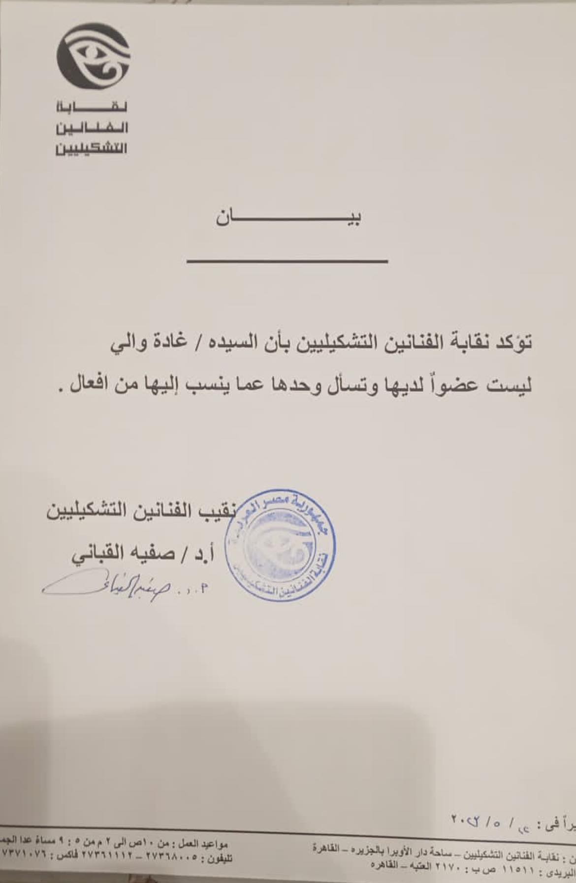 الدكتورة صفية القباني نقيبة الفنانين التشكيليين في مصر، تلقت عدة استفسارات عن موقف النقابة من الاتهامات الموجهة إلى غادة والي وتأثيرها على سمعة الفنانين المصريين داخل مصر وخارجها، خاصة مع بدء ملاحقة غادة والي أمام المحاكم الأميركية، وردت القباني بإصدار توضيح رسمي قالت فيه نصا: غادة ليست عضوة بالنقابة، وتُسأل وحدها عما ينسب إليها من أفعال.