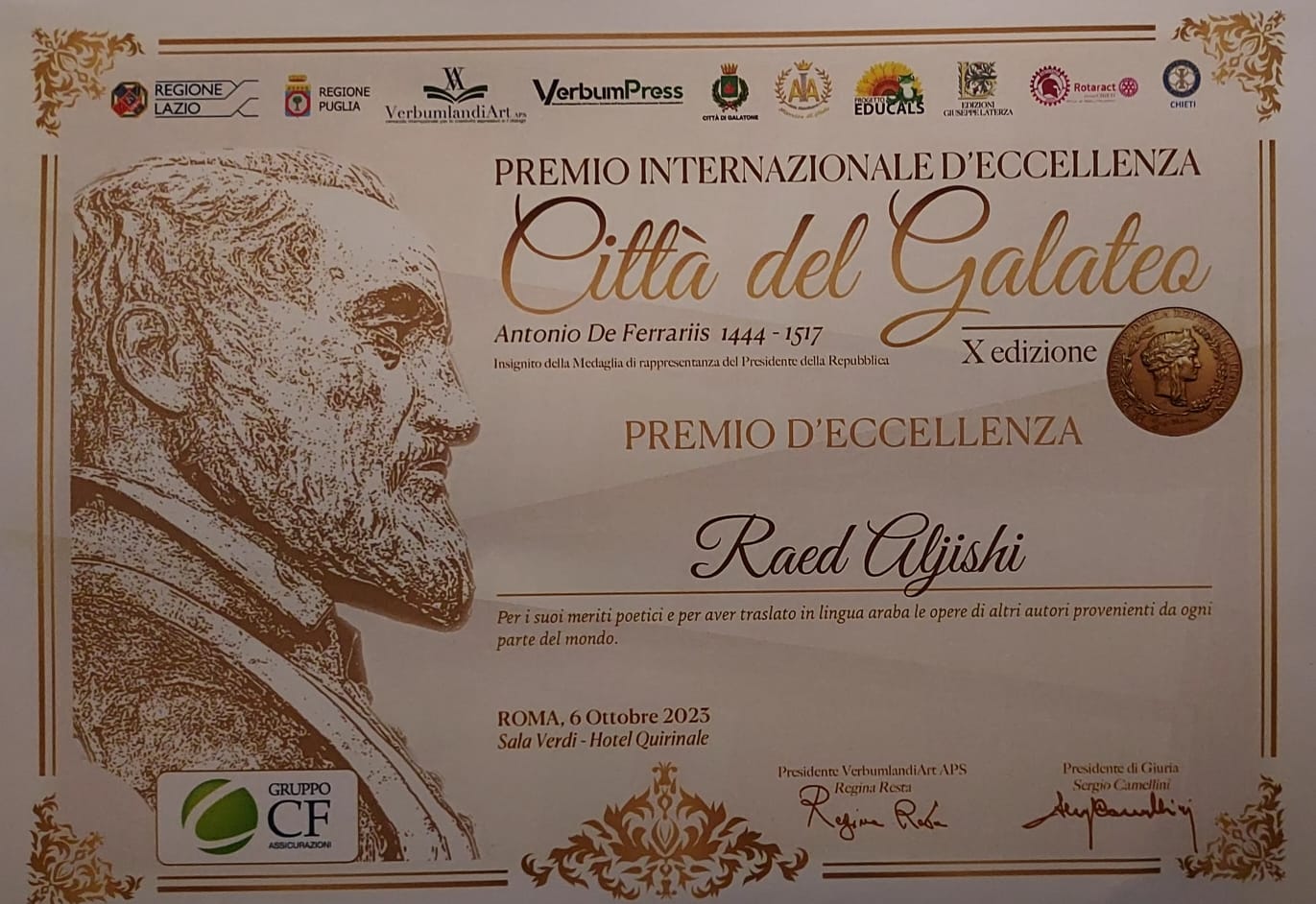 VerbumlandiArt الحاصلة على وسام التميز من رئيس الوزراء الإيطالي. وقد حصل الشاعر السعودي رائد الجشي على جائزة التميز الدولي في الشعر ضمن نخبة من الأدباء الدوليين.