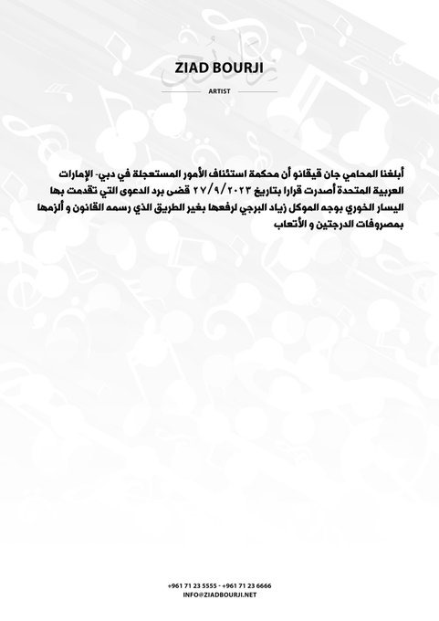 وغرّد برجي اليوم الخميس من خلال حسابه الرسمي على منصة “إكس” مؤكداً أن محاميه جان قيقانو أبلغ بأن قاضي الأمور المستعجلة في دبي، بتاريخ 27/9/2023 ردّ الدعوى التي تقدّمت بها المدعية إليسار الخوري (إليسا) بوجه زياد برجي، لرفعها بغير الطريق الذي رسمه القانون وألزمها بمصروفات الدرجتين والأتعاب”.